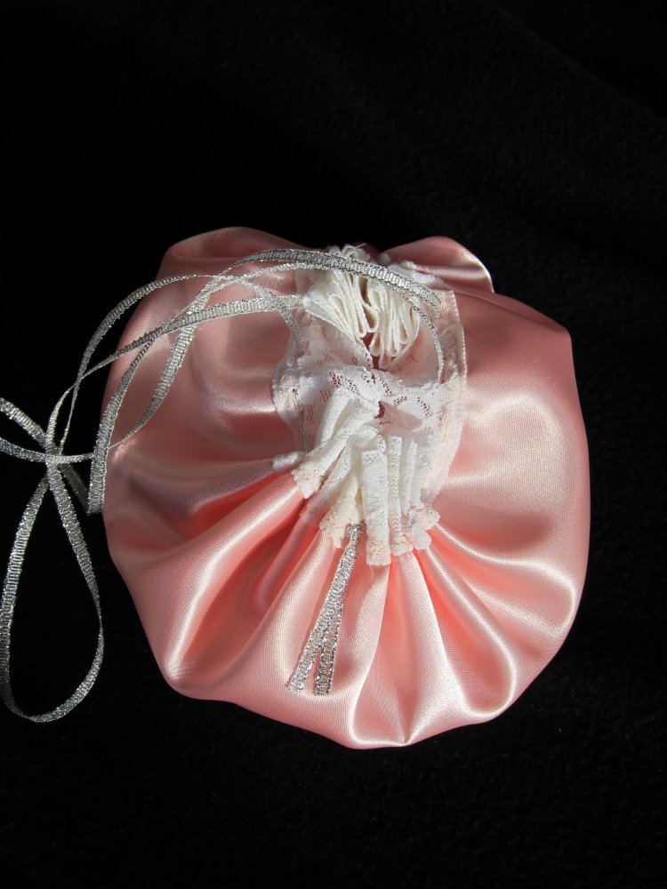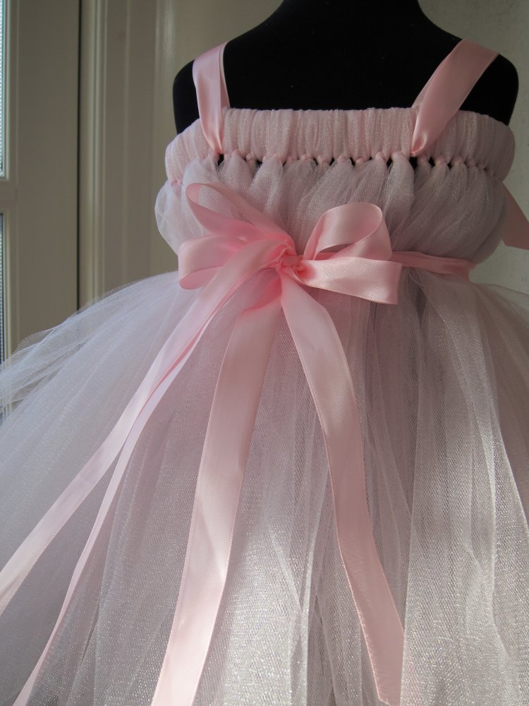 Lyserødt satinbånd i taljen.