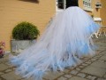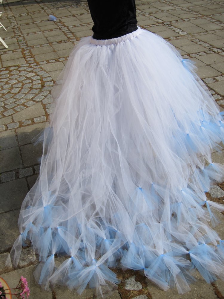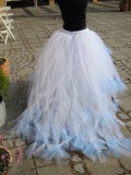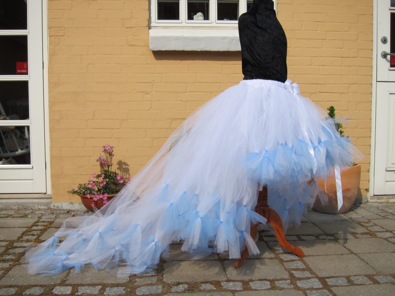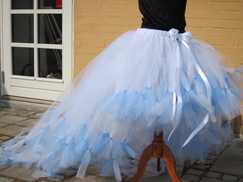 Smukt langt tyl skørt i hvid med blåt puf. Kan dog laves i præcis de farver du måtte ønske. Priser afhænger af str. Send en mail på m.e@os.dk for pris.