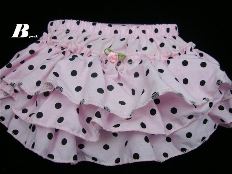 Søde flæsebukser i lyserød med sorte prikker og en fin lille blomst bagpå. Syet i lækker bomuld